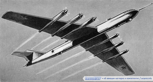 Появление у нас в Союзе отечественных турбовинтовых двигателей Кузнецова, прошедших государственные стендовые испытания, поставило на реальную почву возможность создания у нас дальних бомбардировщиков с турбовинтовыми двигателями. На основании проведенных расчетов выяснилось, что с турбовинтовыми двигателями бомбардировщик с разумной размерностью (не более 130-160 т) можно получить со значительно большей дальностью, чем с реактивными, и она может быть доведена до 14 000-15 000 км и даже до 18 000 км.
