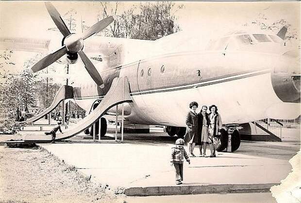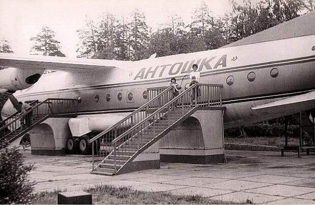 Вот такой самолет стоял в 70-х годах у нас в Казани в Парке Урицкого. Он назывался "Антошка", в нем был детский кинотеатр и кафе-мороженое. Развал СССР он, конечно не пережил. ((