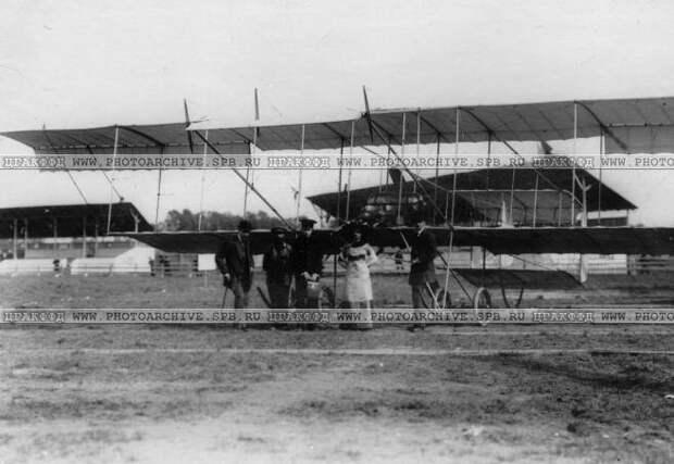 "Лидия у первого серийного самолета «Россия-А» авиационного завода «Первое Российское товарищество воздухоплавания Щетинина и К°».( фото 1910 г.)"